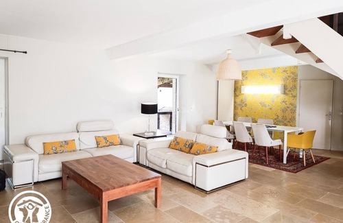 Villa Le Simonet is a beautiful stone house with a contemporary interior of the most beautiful effect, light tones, designer decoration here, paintings there and everywhere, very comfortable and high quality equipment. ..and an impressive double staircase leading upstairs! outside, a covered terrace opening onto a private swimming pool much appreciated during our very hot summers, and a park where young and old can relax... At Villa Le Simonet, everything has been thought out to comfortably accommodate a group of friends, a family, up to 9 people! Only 3 km from all the shops and services, and its proximity to the unmissable tourist sites of this part of the department, La Villa Le Simonet is ideal for making the most of your holidays! On the ground floor: living room with glass doors opening onto the covered terrace, fully equipped kitchen, laundry room with washing machine and all maintenance and cleaning equipment, wc with washbasin. Upstairs, served by a double staircase: 4 bedrooms (1 bed 180, 1 bed 160, 1 bed 140 and a bedroom with 3 beds 90x200, a separate toilet, 2 bathrooms with very large Italian shower. Covered terrace with fully equipped summer kitchen (30m²) opening onto the private fenced swimming pool (13x8), covered carport (30m²), terrace in front of the house, parking, park. to screw) Cleaning included Wifi throughout the gite and around the swimming pool.