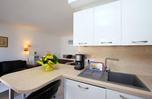 1-room apartment 27 m2 on 4th floor. Fully renovated in 2016, very beautiful furnishings: living/dining room with 1 french bed (160 cm, length 190 cm), TV (flat screen), air conditioning. Exit to the terrace. Open kitchen (oven, dishwasher, 3 induction hot plates, microwave, freezer, electric coffee machine). Shower/WC. Forced-air heating. Terrace 8 m2. Terrace furniture. Facilities: washing machine. Internet (WiFi, extra). Please note: smoke alarm. 06029004080HT