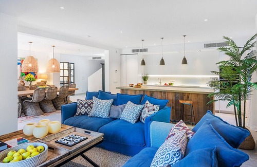 On the ground floor, a huge open plan kitchen-living-dining area, designed with an indoor-outdoor feel and flow, accommodates dining for up to 12 people, along with an kitchen island for 6 people to sit, as well as a huge relaxed seating, sofa / TV area all with a dual aspect overlooking the pool and bar areas.