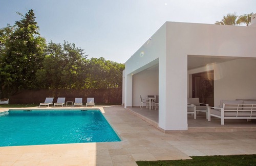 Refurbished private villa located in one of the most sought after areas of Sotogrande, close to the marina and polo fields. The villa has four bedrooms and four bathrooms all located on one level. The villas has it's own WiFi connection and is air conditioned throughout. Outside there is a lovely covered dining and seating area ideal for all seasons, there is a private swimming pool with sun loungers and good sized gardens. The villa also has private parking for two cars. This villa is ideal accommodation for a family holiday.