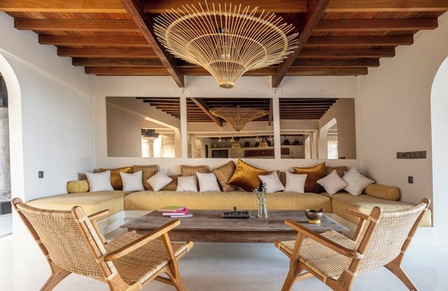 Within the main building, three bedrooms offer cosy comfort, while two additional bedrooms in self-contained thatch-roof guest houses boast luxuriant king-sized beds and oversized bathtubs, three of which open to the sky - perfect for stargazing!