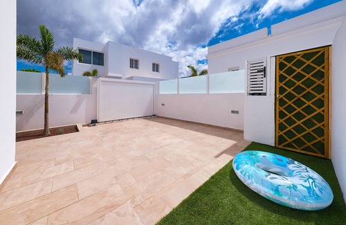 High-quality, newly built vacation villa located just minutes from the beautiful beaches of southern Lanzarote. This exclusive property, ideal for up to 6 people, is spread over two floors and features 3 bedrooms on the upper floor and 2 bathrooms with showers.On the ground floor, you will find a glass-enclosed relaxation terrace and a spacious outdoor area with a private pool that can be optionally heated. The private pool measures 6 x 3 m² and features a salt chlorinator to avoid skin, eye, and hair irritation that can occur with conventional chlorine use. It includes a cover to maintain water temperature and a heat pump to allow heating to the desired temperature (optional). Additionally, there are sun loungers, a solar shower, and garden furniture, perfect for enjoying the sun and fresh air. The house also has a room with a washing machine, iron, and ironing board for the exclusive use of guests.The living room, equipped with air conditioning, has a large sofa, an extendable dining table for 6 people, and a 55” QLED smart TV with international channels.The separate kitchen is fully equipped with high-quality utensils, an induction hob, oven, microwave, refrigerator, dishwasher, kettle, blender, coffee maker, and Nespresso machine.On the same floor, you will find a full bathroom with a shower.Upstairs you will find three bedrooms (all with air conditioning). The master bedroom has a double bed (150 cm) and a large wardrobe, another bedroom has two single beds and a vanity with a mirror, and the third bedroom has a 140 cm sofa bed, a 43" QLED smart TV, and a work desk.Additionally, the house has a second full bathroom with a shower, a hairdryer, and an iron.The entire villa is equipped with high-speed internet (1GB) and Wi-Fi, smart TVs with international channels, a safe, and air conditioning in the living room and all bedrooms. This villa offers all the necessary amenities for an unforgettable vacation as a couple, with friends, or with family, and it is also ideal for smartworking. Private parking space within the property.Bed linen and bath/pool towels are included. Crib and high chair available on request.Luggage scale.