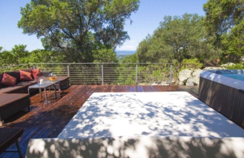 The house is set on eight wonderful view acres, double gated. The main building features the public living spaces with 3 queen and king bedrooms and feature fine Italian high thread count linens, down pillows and comforters. The home is equipped with high speed wireless internet service. On the grounds there is a Private Jacuzzi brand hot tub for 8 people and an adjacent 400 square feet deck with pool and valley views. The main arrival has parking for up to 10 cars and a 3 car garage. Located only 5 minutes to 101 this is an extremely private and quiet location as there are no homes within view of the house and grounds.