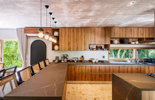 Villa Naj Kan graciously accommodates up to 20 guests across its 9 expansive bedrooms. Its interior design beautifully marries the contemporary elegance of chukum style, characterized by the use of grey cement, with locally sourced wooden accents that infuse the villa with a tropical charm. The overall atmosphere is a harmonious blend of modernity and nature, with spacious open areas that seamlessly merge the ocean with the villa. A sleekly designed pool appears to merge with the horizon, offering a perfect setting to unwind and savor the breathtaking natural surroundings. Despite its secluded location, the villa provides a range of modern entertainment options, ensuring that every guest enjoys a relaxing and fun-filled stay.