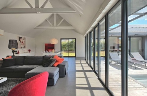 Single-family house "Villa Noalou", built in 2014. 1.5 km from the centre of Arzon, 12 km from the centre of Sarzeau, 35 km from the centre of Vannes, in the residential district, 300 m from the sea, in a cul-de-sac. Private: property 800 m2 (fenced) with lawn and wildlife garden, swimming pool heated (9 x 3 m, depth 130 cm, seasonal availability: 09.Apr. - 01.Oct.). Pool maintenance by the owner/gardener parking on the premises, single garage. Dimension: height 180 cm width 230 cm. Shop 500 m, supermarket 1.5 km, restaurant 500 m, sandy beach 300 m. Sports harbour 1 km, sailing school 2 km, tennis 1.7 km. Nearby attractions: Golfe du Morbihan 500 m, Port du Crouesty 1.5 km, Thalssotherapie 2 km, Golf de Kervers 8 km.