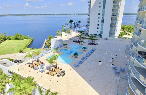 TOP FLORIDA's Villa Oasis is the opportunity to spend your vacation in style and luxury! This 1-bedroom condominium on the 16th floor is overlooking the Caloosahatchee River and the resort pool area. There is a tennis court, a fitness center, a pool and game room and just so much more! All just a short distance from the Historic Fort Myers entertainment district! The comfortable couch in the family room is a queen size sleeper sofa, should you have overnight guests. A designated parking spot in the parking garage and a spot for bikes, if you wish to bring them, are part of the rental as well. Downtown Fort Myers / the River District features lots of unique restaurants, bars, and boutiques!