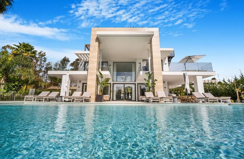 Stunning in its contemporary design, this six-bedroom south-facing villa is situated within the prestigious gated community of Villas Del Marquez on Marbella's coveted Golden Mile. Boasting proximity to both the beach and Puerto Banús, this brand-new property offers a luxurious retreat for those seeking the epitome of elegance and comfort.