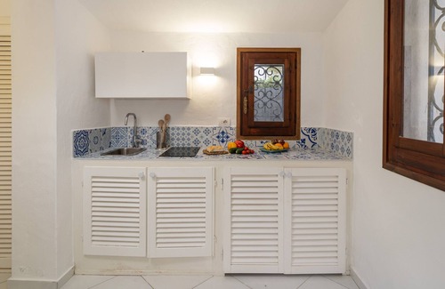 Villa Sandra borders directly with the spectacular Cann’e Sisa beach with its crystal-clear sea of a thousand shades of turquoise. The house is surrounded by a well-kept level fenced garden of about 3000 sq m, for the most part lawn with white-pebble flower beds and embellished by majestic palm trees, typical Mediterranean scrub and evergreen bushes. Immediately past the entrance gate, an illuminated drive lined with hedges leads to the front door. At the sitting room exit is the large portico with an area for outdoor dining, or just simply relaxing in the shade during the hottest hours of the day, elegantly furnished with tables, chairs, sofas and armchairs. The property is located in a very quiet residential area and is well organized to satisfy every need of its guests. Ten metres past the entrance gate, is a covered parking area with space for 3 cars.