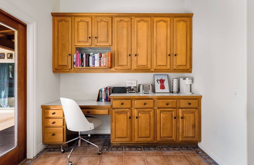 As you venture through the house, stunning artwork draws your eye, and Southwestern touches add to the design. Through the next archway, the formal dining room hosts a table set for six and plenty of sunshine streaming in through sliding glass doors. Beyond the dining room, an expansive kitchen awaits. It’s fully equipped with double ovens, lots of counter space, and all the small appliances you might need. The space extends into an alcove with the sweetest workspace and views of the pool.