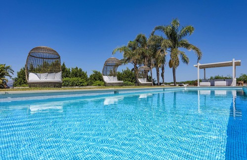 The spacious garden has also been elegantly designed with great taste. Typical Mediterranean vegetation grows here alongside palm trees and tropical plants. In the middle of the garden is a 17-metre swimming pool.