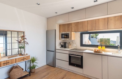 The modern living room has a comfortable sofa and an integrated TV, which will allow you to relax after a long day and enjoy your favorite series. If you prefer, you can enjoy the warmth of its fireplace and the atmosphere that is generated around it. The large dining table, equipped for 4 people, is ready to receive your entire family and enjoy pleasant family dinners. The modern American-style kitchen has everything cooking enthusiasts need. From this living room, we have direct access to the terrace thanks to its glass doors, which also provide light and clarity to the entire room.