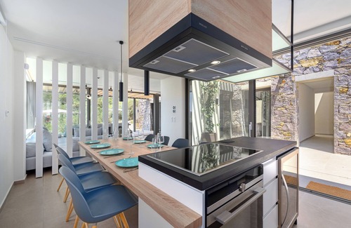 The villa features four elegantly designed bedrooms, three offering infinite sea views. The open-plan kitchen leads into a splendid living room with sea views.