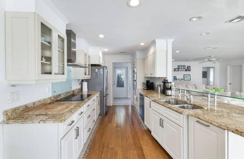 Experience a prime location and unparalleled comfort in this beautiful vacation home. "Villa Tomaso" features an open-concept living space, bright and inviting decor with colorful accents. The heart of the home is a spacious living room that seamlessly flows into a fully equipped kitchen with convenient counter seating and a welcoming dining area.