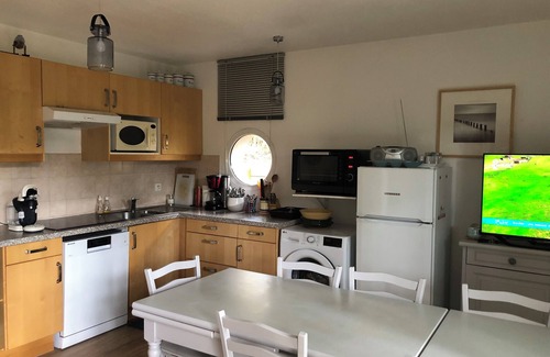 Fully equipped modern kitchen ceramic hob, oven, microwave, espresso machine, coffee maker, kettle, grill pin, refrigerator with compartment ***, dishwasher, full and current crockery, dining area, flat screen TV 81 cm with DVD player, living room opening onto beautiful terrace with table, chairs, parasol, deck chairs and electric plancha, bathroom with bath, separate toilet with washbasin.