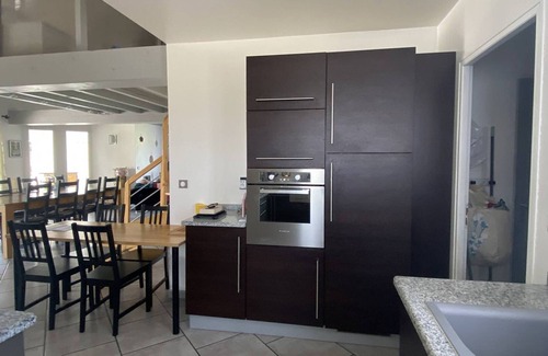 The ground floor consists of a large living room (dining area and lounge area, with TV and WIFI) with an open kitchen, fully equipped (dishwasher, gas hob, oven, etc.). The sleeping area consists of three bedrooms: 1 bedroom with a 140 cm bed, 1 bedroom with a 140 cm sofa bed, 1 bedroom with a mezzanine bed (90 x 190 cm) and a 90 x 190 cm bed. The bathroom with shower and bathtub is also located on the ground floor (sink and mirror). The mezzanine offers a fourth 140 x 190 cm bed.