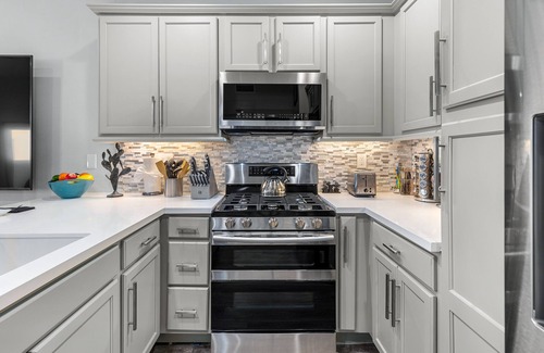 The living space seamlessly spills over into the open kitchen featuring ample counter space, stainless steel appliances, a variety of spices, and all cooking utensils, pots, pans, & bakeware you might need. It is truly a chef’s dream! For your morning beverage of choice, a tea kettle tea and single-cup Keurig coffee maker are available. If you decide to dine in or grab a quick bite to eat before heading out for some shopping, 3 barstool seats are available at the peninsula island.