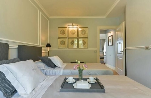 Refined three-room apartment in a villa dedicated to NAPOLEONE, elegant, evocative of the Empire style. Ground floor, 75 sqm, high quality finishes, accessible to disable. Equipped kitchen, sofa bed, two bedrooms, two bathrooms. TV, WI-FI connection, air conditioning. Patio and furnished panoramic terrace, carport in the basement. In the common area: washing machine and tumble dryer, iron. Possibility of breakfast in the room or in common area (Convivio). Access to communal garden and outdoor common pool.