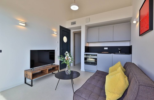 > a 3rd apartment for 2 people, 50 m², with queen-size bedroom and storage space, shower room and toilet, separate additional toilet, fully-equipped open kitchen (fridge, freezer, hob, microwave, dishwasher, Nespresso coffee machine) with central island, living room and private terrace with panoramic sea view.