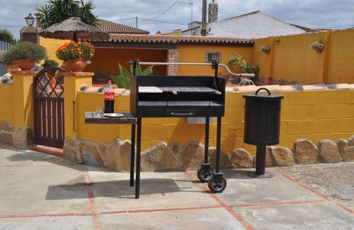Detached house with rustic decoration, located on a private plot of 1. 200mt., Air conditioning and central heating. It has a double bedroom and two single bedrooms with bunk beds, (for six people), fully equipped, in a rural and quiet environment two kilometers from Chiclana de la Frontera. Large fireplace in the living room. It has a private pool with shower, sun loungers. Barbecue, private garden with swings, table football, table tennis, basketball basket. 43-inch TV, fully equipped kitchen with washing machine, ironing board, large enclosed front porch with windows. All the windows and doors of the house have mosquito nets. Garage with roof. The pool is fenced with fence of half height and door to prevent the access of minors. Next to the swimming pool there is a complete toilet.