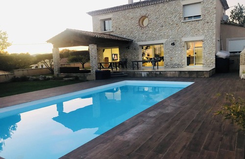 Villa with pool is located in Allegre Les Fumades. Villa with pool provides accommodation, featuring Balcony/Terrace, Kitchen, Pool, among other amenities. This House features Balcony/Terrace, Kitchen, Pool, to make your stay a comfortable one.