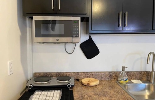 This 1-bedroom, 1-bathroom rental features a dining area and air conditioning. Bathroom amenities include a hair dryer, towels, and toilet paper. The kitchen is equipped with a coffee maker, a microwave, and cookware.
