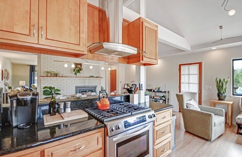 If remote work is on your agenda, or you simply crave a cozy spot by the fire, discover a reclaimed redwood dining table seating eight, a sit/stand desk with dual monitors for work and play, a fireplace for warmth, and a full-size washer and dryer to keep your stay fresh. Tasteful decor permeates the space, ensuring you feel the serene vibe of the area.