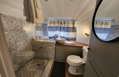 The Airstream is an American icon, a symbol of outdoor luxury, and Frances is no exception. The queen size bed offers breathtaking tree canopy and sky views with the skylights. Equipped with a kitchenette that has a sink, microwave, mini-fridge, and coffee maker, a full bathroom, and AC/heat ensures you are comfortable in the Airstream. A creek side deck, fire pit, gas grill, and picnic table provide just as much relaxation outside. Located near the pool and playground for ease of access to the amenities.