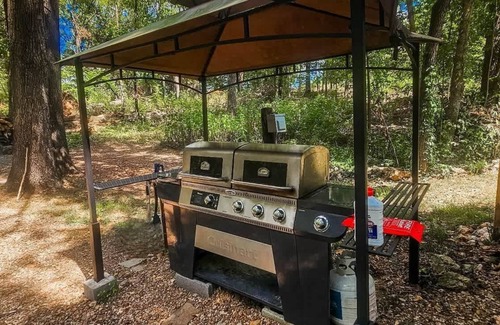 Your area includes the Airstream trailer, covered deck, your own fire pit, an outdoor theater, exclusive hot tub, outdoor kitchen, outdoor dining and outdoor shower.