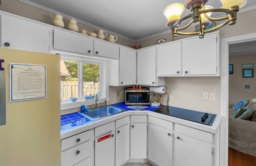 Inside, the cottage is warm and welcoming, with vintage coastal décor and thoughtful updates throughout. Outside, a fully fenced backyard awaits—perfect for relaxing in the hot tub under the stars, grilling on the BBQ, or enjoying a picnic at the outdoor table. Kids and pets will love the large cement play pad and grassy area, while the garage is stocked with beach gear, bikes, boogie boards, and more.