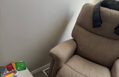 Enjoy a stylish experience at this centrally-located place. Vibrantly warm textures and colors take this space from cozy cottage to whimsical garden. The space features a comfy queen sized bed. Full sized kitchen and cute coffee and tea bar. Living room has super cozy recliner sofa. Washer dryer included. Featuring a gym and spa space that promotes wellness and self care.
