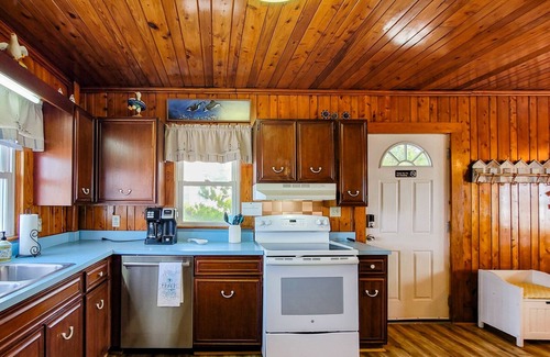 As you walk into the entry door, you’ll find the wide kitchen to your right, overlooking the street. You’ll find the dining area opposite the kitchen toward the ocean, complete with a corner bench so everyone can dine while watching TV in the nearby living area. Just off the living area on the ocean side of the house is a wide sunroom that also has a washer, dryer, and a half bathroom at one end. You’ll enjoy having ocean views like you would on the deck, but in the air conditioning! The master bedroom has a California King bed, and the second bedroom has a Queen and Twin bed. Cable TV and wireless internet are provided for the time you spend indoors.