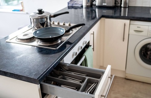 Vista Court is a stylish 2 bedroom flat, comfortably accommodating 3 guests. Bright Spacious lounge/kitchen area, 2 bedrooms and family bathroom. The open multiuse room fits the dishwasher, washing machine, oven, dining table, couch and 40" smart TV to give an open plan feel. The dining table can extend to double as a workspace with plenty of room for multiple laptops and plug sockets close by. The main bedroom has a Superking hotel bed, large smart TV and a built in wardrobe. The second bedroom has a single bed and wardrobe. There is secure, private underground parking available, taller vehicles may struggle but there are plenty of other parking options close by.