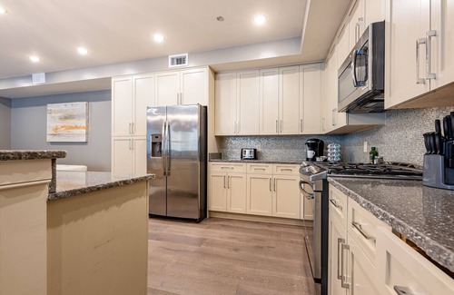This unit features a full kitchen equipped with everything needed to cook at home: