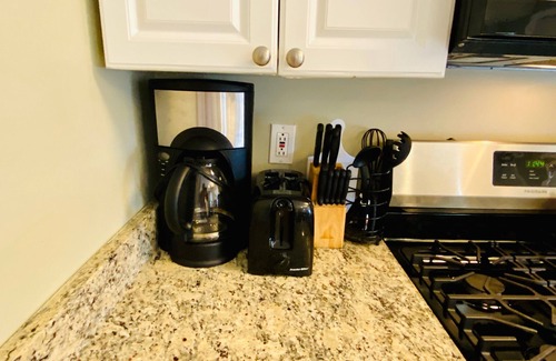 This professionally designed, SECOND floor, non smoking, two bedroom Suite (Sleeps 4 adults and 2 children under 12) has an open floor plan with a large living room with large smart TV, full kitchen including small appliances, full size refrigerator, dishwasher & microwave. All cookware & dinnerware provided. Full bathroom with tub and shower. Bedroom has a queen size bed, furniture, large smart TV and closet system for organization. Living room has a double twin mattress Day Bed. This property has a multi machine coin operate laundry just steps from the Suite. Standard WIFI Internet provided through out the property by FIOS .