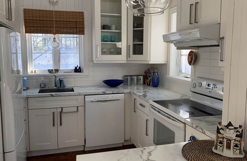 As you settle into the place, you'll find a BBQ grill, a fireplace, and air conditioning. In addition, there's a jetted tub, along with towels, shampoo, and soap. The kitchen is equipped with an oven, a stovetop, and a refrigerator, as well as a coffee maker, an electric kettle, and a microwave. And you won't have to pack extra clothes, because you'll have a washer and dryer, too.
