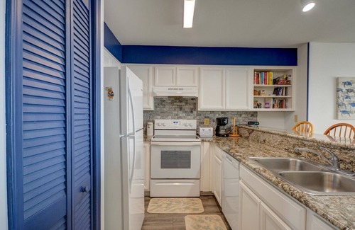 Upon entering "Wading For You", you’ll be greeted by a beautifully appointed interior. The modern kitchen boasts granite countertops and a high-rise bar, ideal for casual dining or entertaining. The open floor plan seamlessly connects the kitchen to the dining and living areas, creating a spacious and inviting atmosphere. A 65” flat-screen Smart TV adorns the living room wall, complemented by comfortable reclining furniture where you can unwind while admiring the ocean vista.