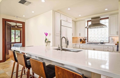 This professionally-designed, ground-level, oceanview residence offers a great room with sliding glass pocket doors for indoor/outdoor island living, a chefs' kitchen outfitted with professional-series, stainless steel appliances/gas range, dual master suites and a guest bedroom with 2 twin beds. Additional features include air conditioning and ceiling fans, washer/dryer and a furnished lanai with Wolf outdoor kitchen (BBQ, refrigerator). This residence is about 1 mile from the ocean. Guests will enjoy sweeping ocean, golf and mountain views, resort charging privileges and access to Hale Ikena Recreation Center, which is walking distance from this residence.