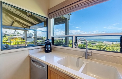 Light colors and high ceilings add to the spaciousness of this comfortable Wailea vacation rental. The large glass sliding doors and windows that cover a majority of the living room allow natural sunlight to flood in.