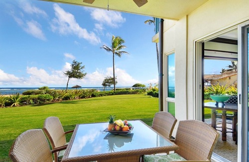 Oceanfront! Live the Dream! Ultra Luxury "Beachfront" Ground Floor Unit A104 at Waipouli Beach Resort & Spa offering stunning full oceanfront views from every room, with watercolor sunrises, whale watching and romantic dinners on the lanai with a 180 degree lush green lawn surrounded by panoramic ocean views.