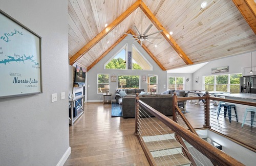 This beautiful 4500 sq. ft. lakefront home sits on Norris lake near the Cedar Creek Road jumping bridge landmark in the popular Lakeside Estates. Waker’s Paradise is tucked into the wooded mountainside facing the lake for a panoramic view of the mountains and water.