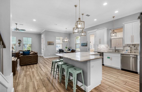 If you are craving the beach, you can have it all at Sea Ya Sun in Emerald Waters Village! This custom-built 4 bedroom, 3.5 bath home has 10 ' ceilings, designer touches, and upgrades galore. Enjoy special extras in the kitchen such as the under-counter icemaker and beverage center in addition to stainless appliances and a large kitchen island. This beauty also includes two living rooms and 3 bedrooms with king-sized beds! Kids will love the bunkroom with built-in bunks boasting two twins, two Fulls, and a flat-screen TV, enabling this home to sleep 12 guests comfortably. There's also plenty of room for your group to relax in the fenced backyard with your own private grill and outdoor shower. Take a short stroll to the gated beach access (about 500 yards) or a have dip in one of the two neighborhood pools (The North Pool is Seasonally heated). Sea Ya Sun is sure to give you the perfect beach experience!