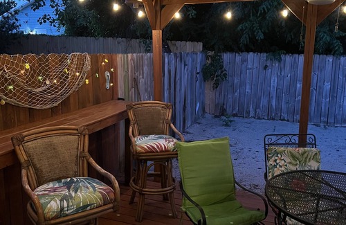 Beautifully appointed beach bungalow w/ plenty of parking for boat. Steps to beach or boat ramp to bay but no steps to climb to house. Private backyard Tiki bar with fenced back yard and grill and fish cleaning sink. Fully appointed kitchen. Special pricing for monthly rental during off peak season. Rollaway bed Sleeps 9. Golf cart available as an option; price depends on length of stay but a fraction of the cost to rent at an off site agency.