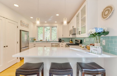 Inside, discover a bright, airy haven adorned with chic design touches. Gather for cozy movie nights on the comfortable sofa. The dining area, bathed in natural light, offers seating for 6, while the fully equipped kitchen beckons offers additional barstool seating and everything you need to prep and serve at home.