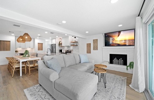 Bright & welcoming waterfront home with 4 bedrooms, 3 bathrooms & has the river in your backyard! Bring your boat! It's an easy walk or bike ride to Cocoa Beach. This home provides an open floor plan with a kitchen that comes with all the essentials. The inviting kitchen & dining area seats 10 people and opens right into the comfortable living room for relaxing & waterviews. The primary bedroom has a king size bed, walk in closet and work/desk area with sliders that open up to the pool & river. The primary bathroom is spacious with a beautiful hotel like feel. The 2nd bedroom has a king size bed, the 3rd bedroom has 2 full beds and the 4th bedroom has a queen size bed with its own private bathroom. The pool area has a heated pool & hot tub & we include pool towels, outdoor kitchen with seating overlooking the canal, a fire pit area & plenty of space to lay out or sit & watch the sunset. Spot manatees & dolphins or catch fish off the docks. At night you can also see the bioluminescence sparkle in the water. We provide paddle boards & kayaks to enjoy on the river. The garage has a ping pong table, corn hole, darts, bikes and lots of beach toys for you to use. Located just minutes from the Beach, Ron Jon surf shop, Cocoa Beach Pier, downtown Cocoa Beach, Port Canaveral & local restaurants. We are also less than 30 minutes away from the Kennedy Space Center, USSSA Space Coast baseball / softball Complex and the Brevard Zoo. If you are up for a day at the theme parks we are about 1 hour away from Walt Disney World, SeaWorld, Universal Studios, Islands of Adventure & all the great attractions in the Orlando area.