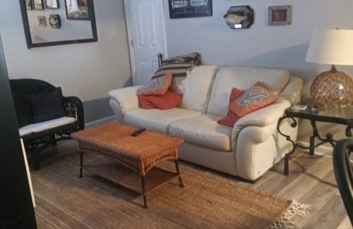 Location! Cozy upstairs condo in small quiet complex located a short walk from South Forest Beach, and one mile from Coligny Plaza, Hilton Head's "downtown". Recently remodeled throughout, fully furnished with a mix of vintage, beachy, quirky nautical decor. Dependable, high speed internet for keeping up with work. Lots of books and movies to enjoy after a sunset stroll or bike ride on the beach or choose from premium channels on streaming TV service. The complex features a temperature controlled pool, personal parking space, and is adjacent to shaded bike trails. The guest bedroom has a view of the tropical tree canopy, blackout draperies, ceiling fan. Beach and pool gear is provided.