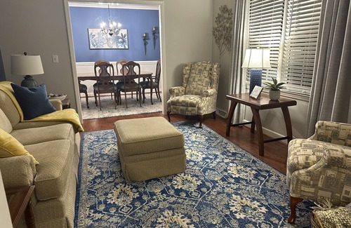 The house has a living room and a dining room with a table that will seat 6. The family room has a Smart TV, gas log fireplace and comfy seating. The family room and kitchen is an open concept. The eat-in kitchen will seat up to 8. The kitchen is fully equipped with dinnerware, pots, pans, bakeware, oven, stove, microwave, refrigerator and drip coffee maker.