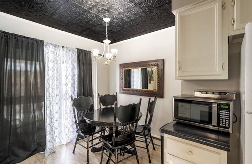 These accommodations are just a short walk from historic downtown Sheridan. You'll enjoy the beauty of Residence Hill, host to many of Sheridan's early1900's builds. An ATM is directly in your path on the way to downtown and you won't have to do the dreaded parking wars of downtown on busy weekends, besides the walk in this quaint neighborhood is part of the charm! There is plenty of parking on this corner lot! Everything about this is incredibly convenient, including groceries at Ridleys just blocks away as well as notorious stops like King's Saddlery and the Mint Bar. A private balcony in front and a small backyard patio give you great options for relaxing during your downtime. We love that even though this is an apartment, the common stairwell separates the two units, which just feels more private. It offers, 2 queen beds, a full-size trundle bed and the living room couch is a sofa sleeper. It's not a charming 1920's craftsman like some of the homes around it but it is a quality set-up with incredibly comfortable beds!