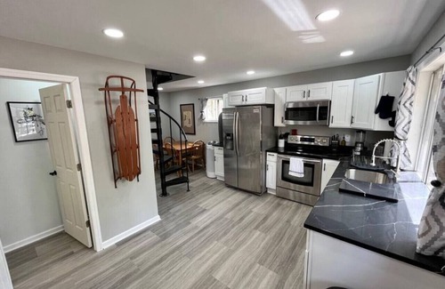 You approach the front with a full length porch that has Adirondack chairs aside an antique ski lift from the old Vernon Valley Resort to relax in. Across the deck is a picnic table to enjoy a nice outdoor meal. Once inside, guests will find a brand new fully equipped kitchen ready for any cooking they plan to do. Updated Stainless Appliances including a dishwasher and Ice/Filtered drinking water are there for your comfort. The living room adjacent to the kitchen includes a 42" TV with Roku enabled. Below that is an easy to use propane fireplace (Turned off during Summer). Games located in the built-ins and guests will find a getaway guide which includes comprehensive information on the property and local area. Opposite corner of the living room you will find cozy dining room for 4 adjacent to the rear entry and spiral stairs.