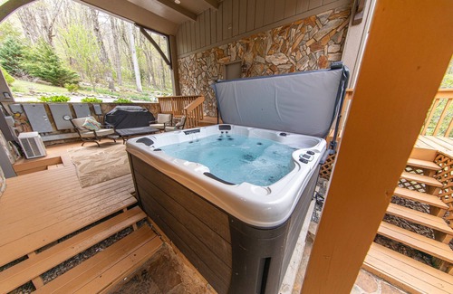 The outdoor space of this Pet Friendly Banner Elk Lodge is what sells this cabin - the breezeway separating the main house from the guest house, multi-level decks, enjoy the outdoor dining space, a new gas grill, plenty of outdoor seating, a family-friendly firepit, the family-size hot tub, and what was previously mentioned but deserves an additional highlight, and the gentle sounds of nature; the trickling of the Watauga River.