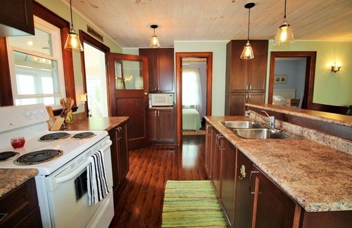 This 1930's built waterfront cottage is a welcoming retreat from the hustle bustle of life. It is a charming two bedroom cottage with sleeping for six people in two double beds and a pull-out couch. The dining room floor is original and looks like a hand-painted rug. You wouldn't see that in homes today. It really is a reminder of simpler times.